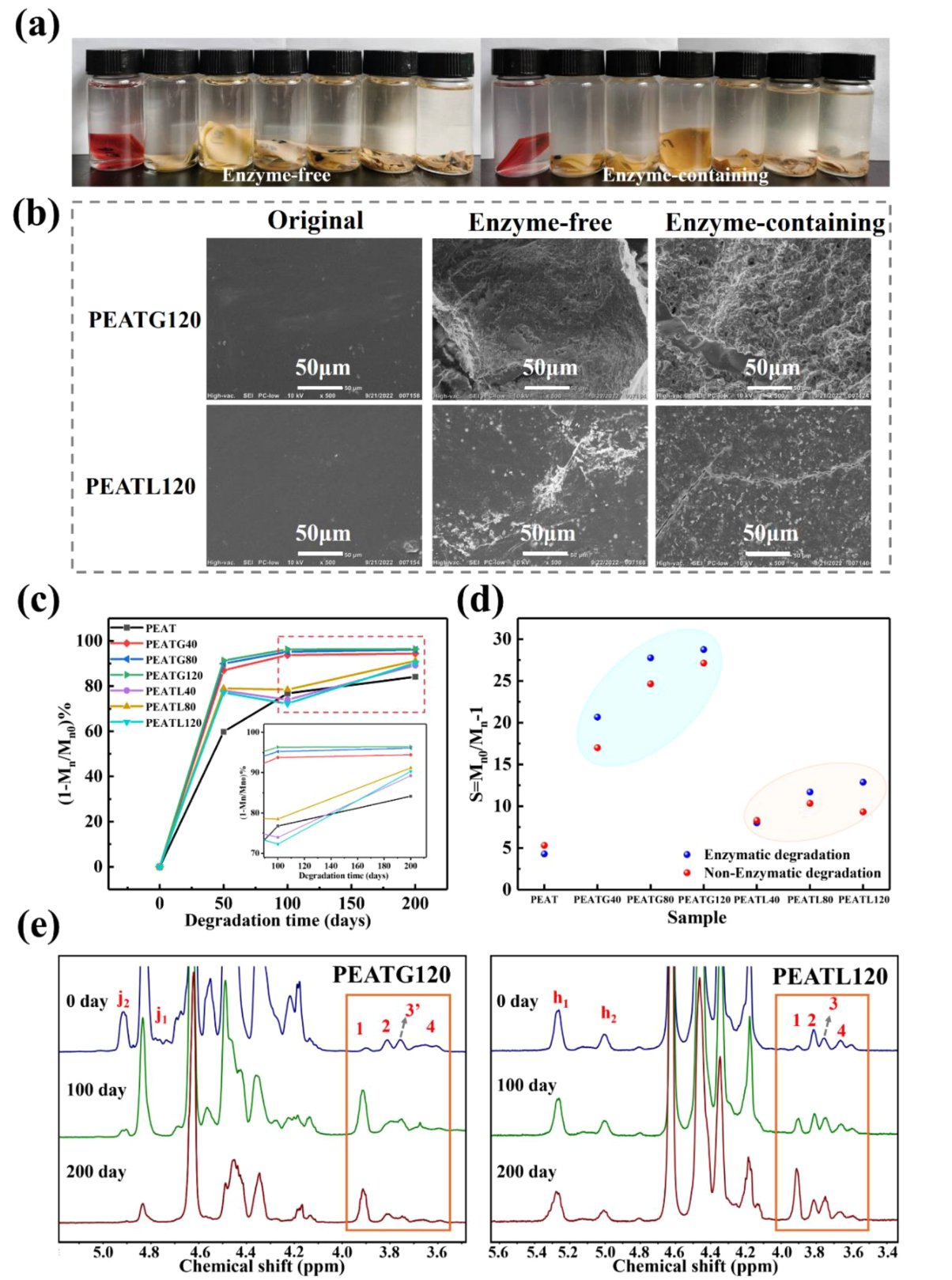 (a) 无酶与有酶缓冲液中的降解比较;(b) PEATG120/PEATL120 表面结构变化;(c) Mn 的时间演变;(d) 链断裂数目 S 的变化;(e) 降解后 PEATG120/PEATL120 的 1H NMR 谱。GA/LA 的引入实现了“高强度+快速降解”的设计目标,且降解过程呈现明显的体相降解特征与可控性。