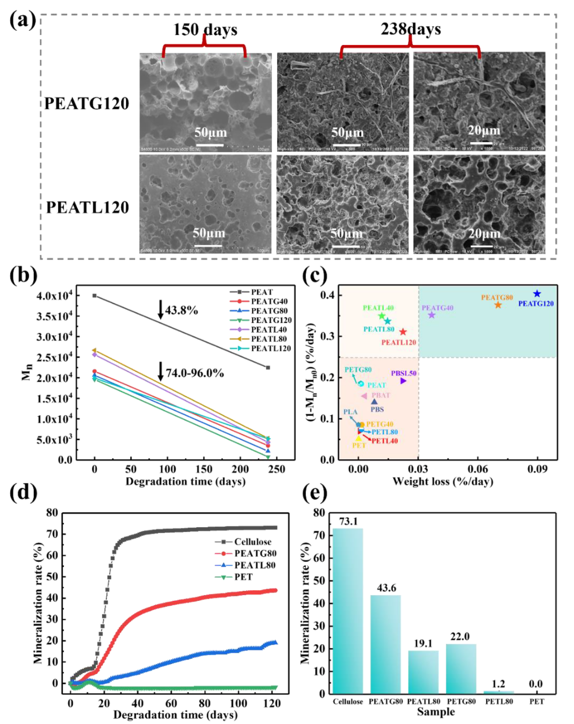 实验结果表明,该策略有效突破了传统材料的性能瓶颈。新型PEATG/PEATL共聚酯凭借增强的分子间作用力,在无定形结构下实现了高达69.9 MPa的拉伸强度,力学性能远超商业化PBAT产品。更重要的是,材料在保持高强度的前提下并没有牺牲降解性:高强度PEATG120薄膜在南海海域浸泡238天后,分子量骤降96%,同时出现明显的蜂窝状侵蚀;另外,PEATG80样品在工业堆肥条件下122天内的矿化率达到了43.6%,充分证明了其作为高强度、海水可降解材料的实际应用价值。