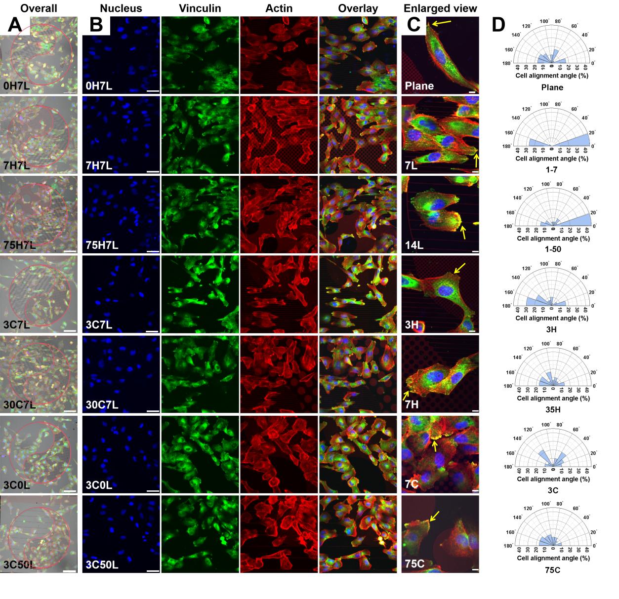 研究团队提出采用飞秒激光无掩模光学投影光刻技术,制备不同形貌的可编程细胞培养芯片,实现对细胞形态和细胞行为的调控。如图1所示,该细胞培养芯片结构能够调控细胞在不同线间距、柱直径及孔径的支架结构上的迁移、黏附及形态变化。