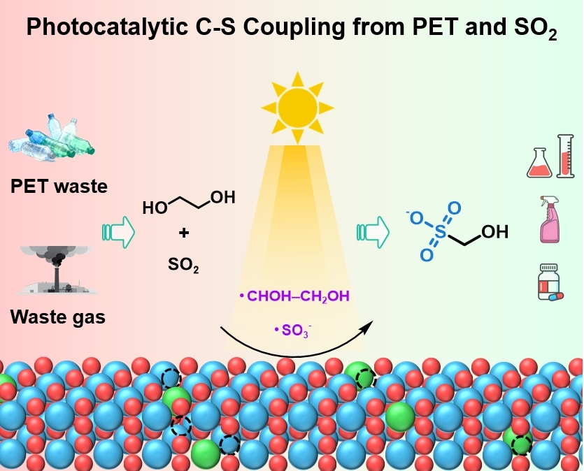 近日,团队以废弃PET与SO2废气为原料,在光照条件下成功将废弃PET衍生的乙二醇高效转化为HMS和氢气。研究人员设计了Cu1/TiO2光催化剂,在365 nm光照条件下,HMS生成速率约为2.31 mmol gcat-1 h-1,氢气生成速率约为4.36 mmol gcat-1 h-1。原位谱学表征结果证实单原子Cu位点选择性捕获光生电子,显著提升光生电子-空穴对的分离与转移效率,有效增强催化活性。电子顺磁共振与密度泛函计算进一步揭示了反应路径:光生空穴氧化乙二醇与亚硫酸根离子,生成的自由基物种间发生C─S偶联反应,最终生成HMS。该工作不仅为有机硫化合物的合成提供了新的合成策略,同时也为废旧塑料的高附加值转化开拓了新途径,丰富了PET升级回收产物谱系。